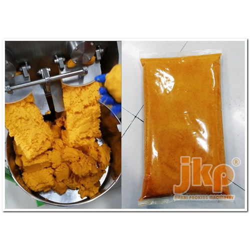 Can be applied to packing products of multiple package specifications. By replacing relative parts, one machine is able to pack products with unit weight ranging from 500g - 6000g.